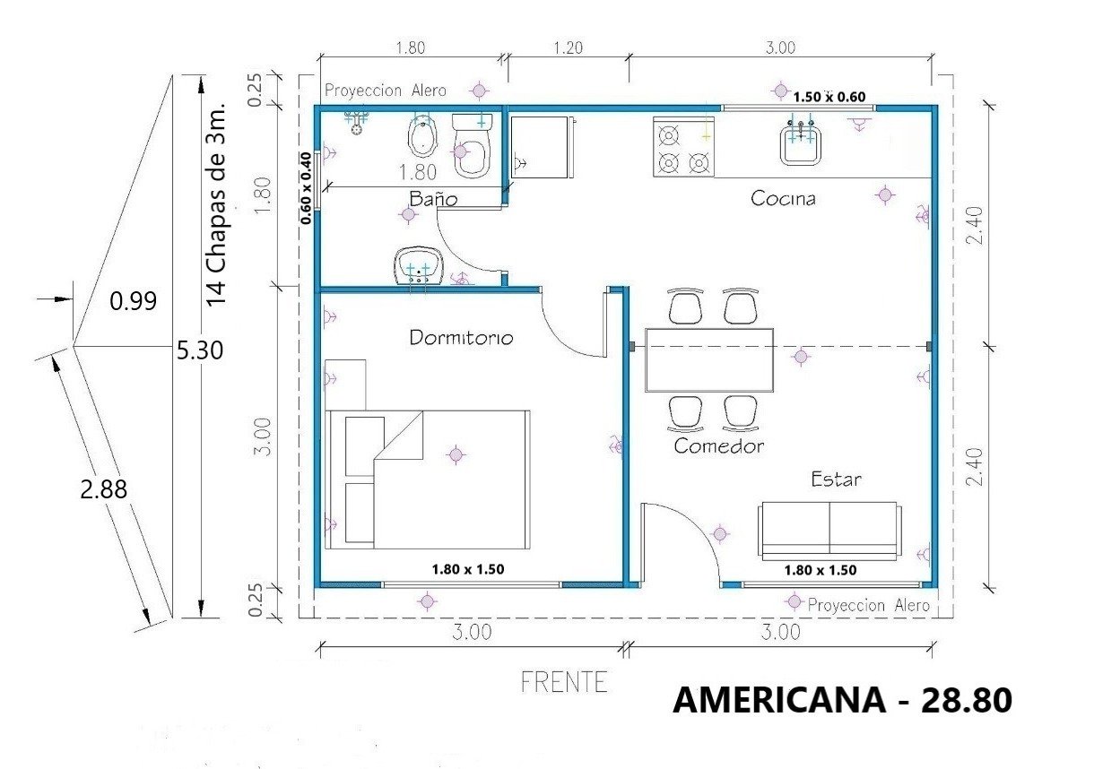Este modelo Americana está pensado para quienes buscan una casa práctica, acogedora y lista para vivirla. Su diseño clásico con techo a dos aguas le da identidad, mientras que la distribución es cómoda y funcional para el día a día. Una opción ideal si querés empezar por algo propio sin resignar comodidad.