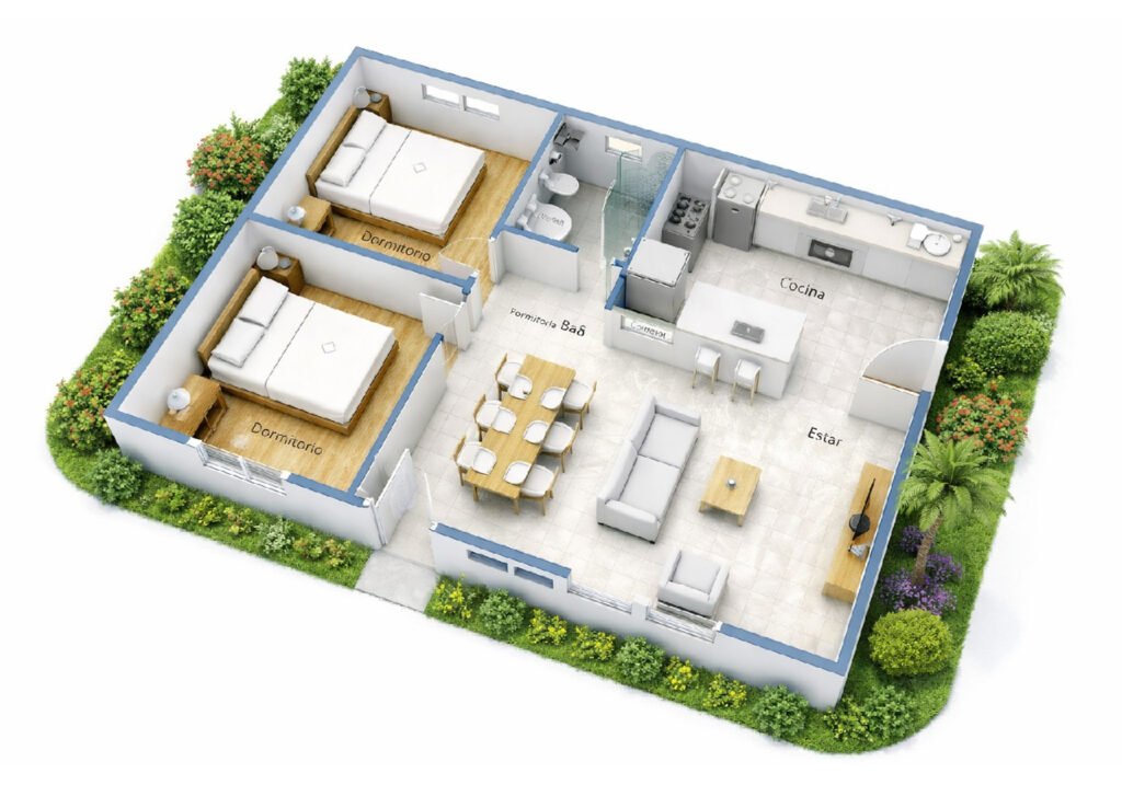 Este modelo Americana se caracteriza por una distribución más abierta hacia el frente, lo que le da una sensación de mayor amplitud desde el ingreso. Los ambientes se organizan de manera cómoda y funcional, manteniendo el espíritu cálido de la línea. Es una casa pensada para disfrutar de espacios más abiertos, con una circulación práctica y agradable para la vida diaria.