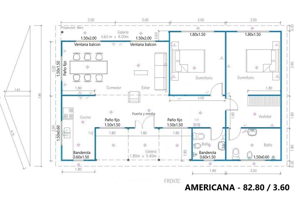 Esta es la versión más grande de la línea Americana, pensada para quienes buscan más espacio, más comodidad y mayor privacidad. La distribución permite disfrutar de dos dormitorios bien definidos, uno de ellos con vestidor, y suma un segundo baño que aporta confort al día a día. Al frente, la galería semicubierta amplía aún más las posibilidades de uso y encuentro. Una casa completa, cómoda y lista para acompañar una nueva etapa.